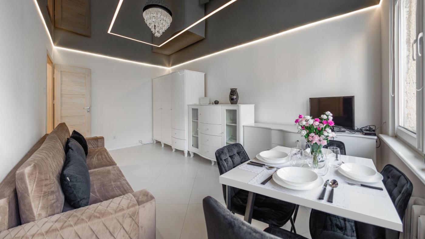 Oferta apartamentu obejmuje sypialnię (1), salon, aneks kuchenny z pełnym wyposażeniem, w tym lodówką i ekspresem do kawy, a także łazienkę (1) z prysznicem oraz suszarką do włosów. W apartamencie zapewniono ręczniki i pościel.